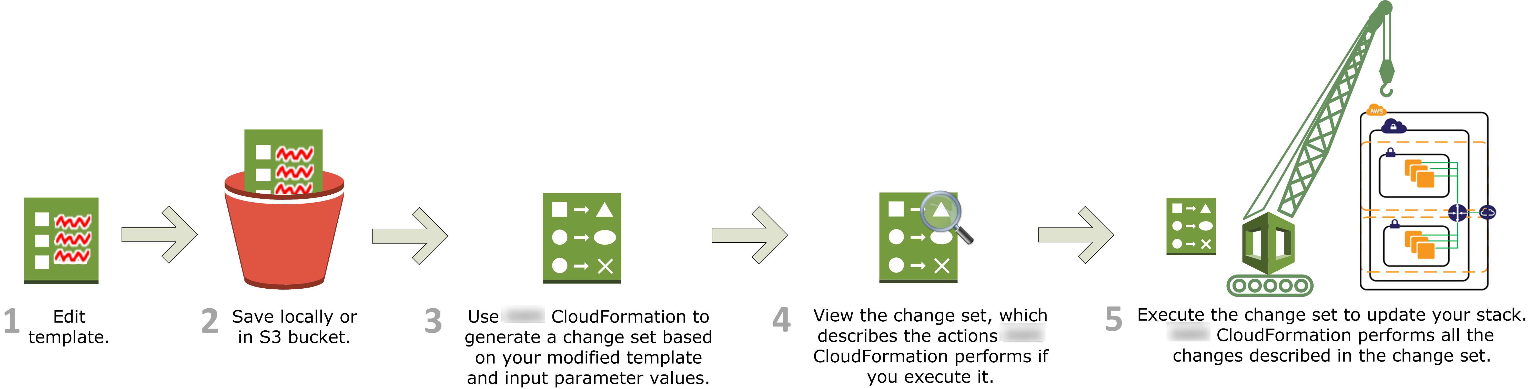 在需要更新堆栈的资源时,您可以修改堆栈的模板。您不需要创建新堆栈和删除旧堆栈。要更新堆栈,请提交修改的原始堆栈模板版本和/或不同的输入参数值以创建一个更改集。CloudFormation 将修改的模板与原始模板进行比较并生成一个更改集。更改集列出了建议的更改。在审核更改后,您可以开启更改集以更新堆栈,也可以创建新的更改集。以下示意图概述了用于更新堆栈的工作流程。