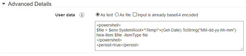 启动实例时,在启动实例向导的 Step 3: Configure Instance Details (步骤 3:配置实例详细信息) 页面上的 Advanced Details (高级详细信息)、User data (用户数据) 中指定脚本。以下图像中的示例在 Windows 临时文件夹中创建文件,在文件名中使用当前日期和时间。当您包括 <persist>true</persist> 时,每次重新引导或启动实例时将运行脚本。如果选择以文本形式,Amazon EC2 控制台将执行 base64 编码。