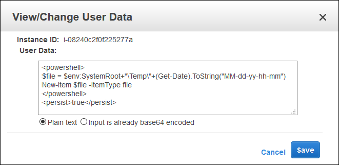 PS C:\>$NewScript = Get-Content -Rawnew-script.txtPS C:\>$NewUserData = [System.Convert]::ToBase64String([System.Text.Encoding]::ASCII.GetBytes($NewScript))