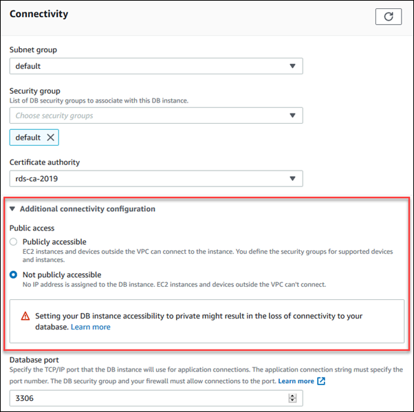 您可以通过修改公开访问选项,修改数据库实例来启用或禁用公开可访问性。有关更多信息,请参阅数据库引擎的修改部分。