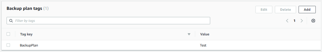 { "TagList": [ { "Key": "BackupPlan", "Value": "Test" } ] }
