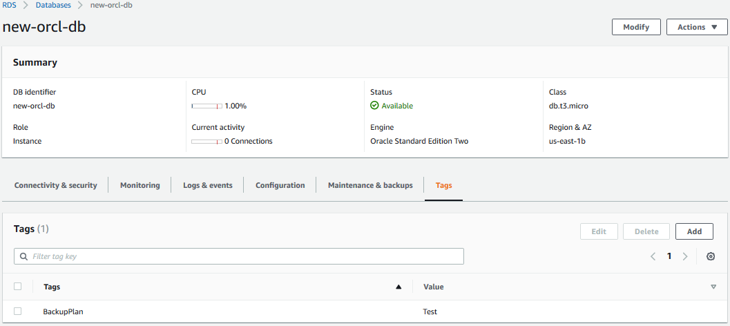 aws rds add-tags-to-resource ^ --resource-name arn:aws:rds:us-east-1:123456789012:db:new-orcl-db^ --tags Key=BackupPlan,Value=Test