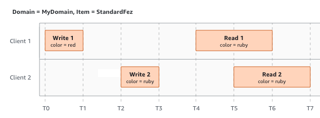 在下一个示例中,W2 不会在 R1 启动之前完成。因此,R1 可能会返回 color = ruby 或 color = garnet。但是,由于 W1 和 W2 在 R2 开始之前完成,因此 R2 会返回 color =