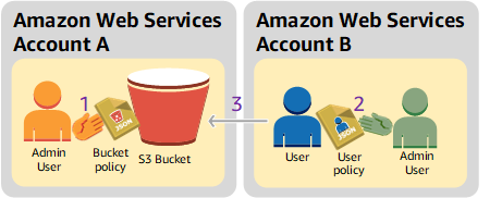 账户 A 管理员用户附加一个存储桶策略,该策略向账户 B 授予执行特定存储桶操作的跨账户权限。
