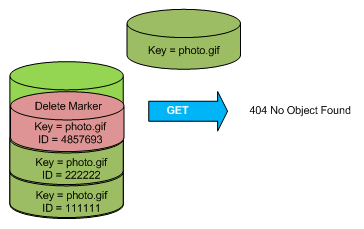 DELETE 数据元时,所有版本都将保留在存储桶中,且 Amazon S3 将插入删除标记,如下图所示。