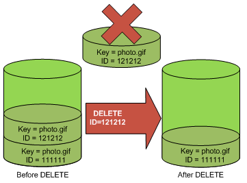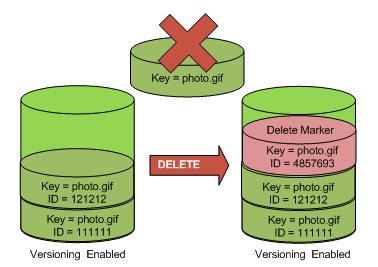 您可以通过指定要删除的版本来永久删除对象。只有 Amazon S3 存储桶的拥有者才能永久删除某个版本。下图显示了 DELETE versionId 如何永久删除存储桶中的数据元以及 Amazon S3 不会插入删除标记。