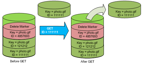 但是,您可以通过指定对象版本 ID,通过 GET 获取非当前版本的对象。在下图中,GET 特定对象版本 111111。即使该对象版本不是当前版本,Amazon S3 也会返回它。
