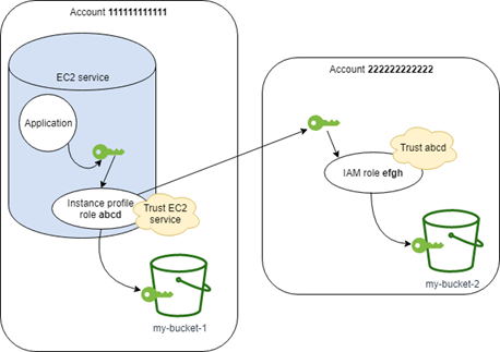 假设您使用两个 Amazon 账户,并希望允许 Amazon EC2 实例上运行的应用程序在两个账户中运行 Amazon CLI111111111111 账户中。该实例包含 abcd 实例配置文件角色,以允许应用程序对同一 111111111111 账户中的 my-bucket-1 存储桶执行只读 Amazon S3 任务。不过,还必须允许应用程序担任 efgh 跨账户角色以访问 222222222222 账户中的 my-bucket-2 Amazon S3 存储桶。