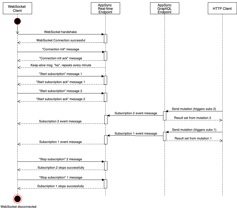 以下顺序图和步骤显示了两者之间的实时订阅工作流 WebSocket 客户端、HTTP 客户端和Amazon AppSync.