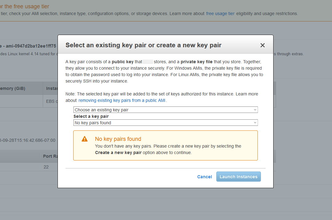 将弹出一个窗口,标题为选择现有key pair 或创建新的key pair. 它将如下所示: