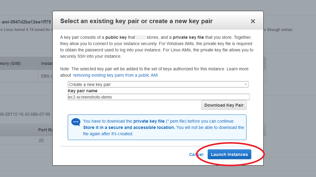 下载私有密钥文件(.pem 文件)。稍后登录 Amazon EC2 实例时,将需要此文件。
