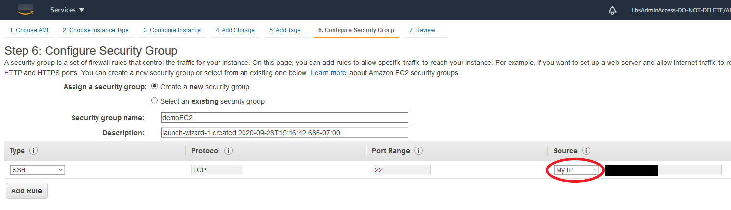 注意 您只能从当前的 IP 地址访问 demoEC2 安全组。如果您的 IP 地址发生变化,则必须更新安全组。