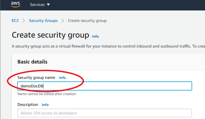 现在,您将在默认 Amazon VPC 中创建一个新的安全组。安全组demoDocDB允许您通过端口 27017(Amazon DocumentDB B 的默认端口)从 Amazon EC2 实例连接到您的 Amazon DocumentDB 集群。