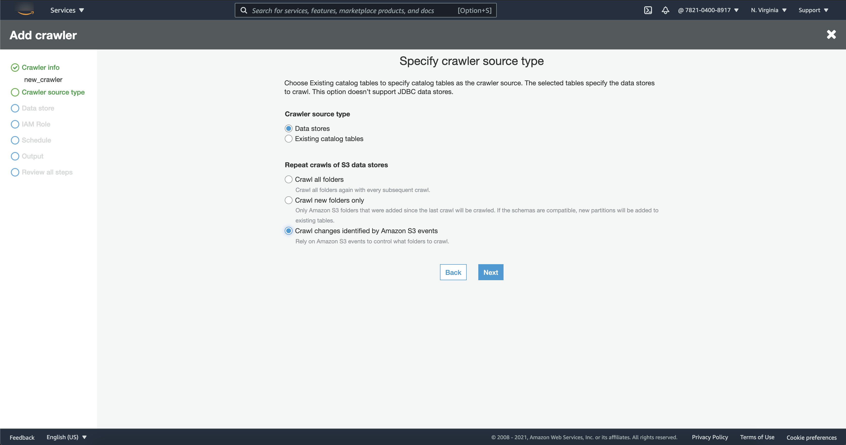 将 Crawl changes identified by Amazon S3 events(网络爬取 Amazon S3 事件识别的更改)选择为 Repeat crawls of S3 data stores(重复对 S3 数据存储进行网络爬取)。