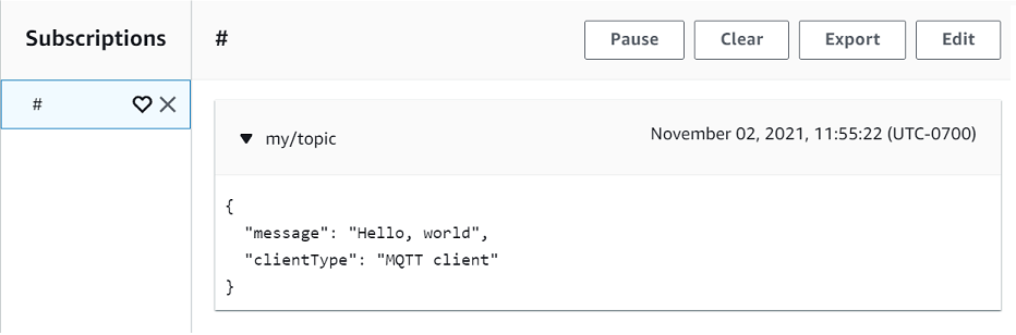 { "message": "Hello, world", "clientType": "MQTT client" } -