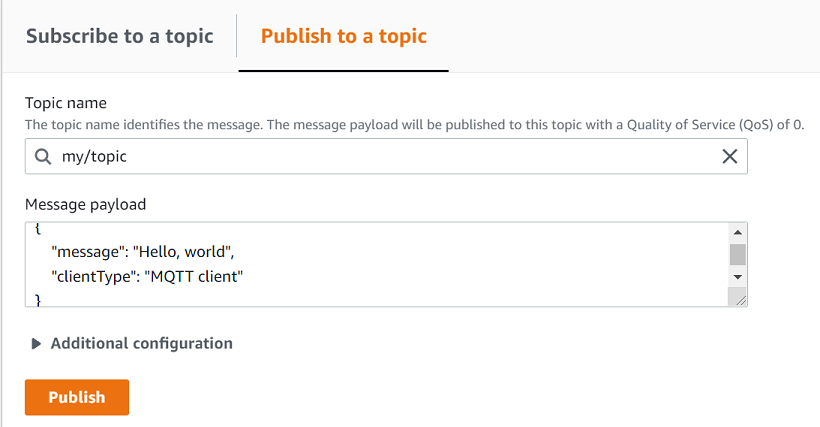 注意 确保您已订阅 my/topic 主题,然后再发布您的消息。