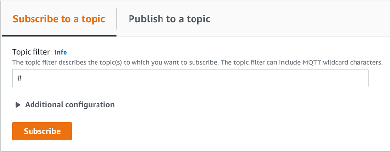 如果您的消息未按预期在消息日志中显示,请尝试按照 主题筛选条件 中所述订阅通配符主题筛选条件。MQTT 多级通配符主题筛选条件是哈希或井号 (#),并且可以用作 Subscription topic(订阅主题)字段中的主题筛选条件。