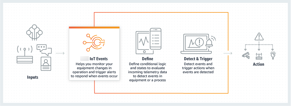 Amazon IoT Events当您连接同构设备时,会自动扩展。您可以为特定类型的设备定义一次检测器,该服务将自动扩展和管理该设备连接到的所有实例Amazon IoT Events.