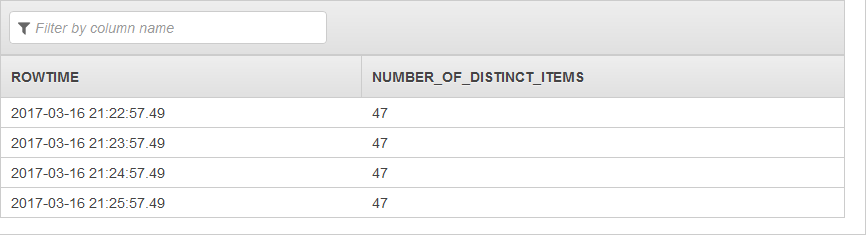 CREATE OR REPLACE STREAM DESTINATION_SQL_STREAM ( NUMBER_OF_DISTINCT_ITEMS BIGINT); CREATE OR REPLACE PUMP "STREAM_PUMP" AS INSERT INTO "DESTINATION_SQL_STREAM" SELECT STREAM * FROM TABLE(COUNT_DISTINCT_ITEMS_TUMBLING( CURSOR(SELECT STREAM * FROM "SOURCE_SQL_STREAM_001"), -- pointer to the data stream 'TICKER_SYMBOL', -- name of column in single quotes 60 -- tumbling window size in seconds ) );