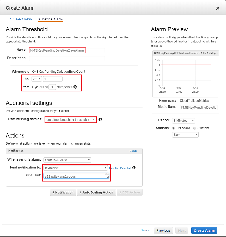 KMSKeyPendingDeletionErrorAlarm。您还可以添加可选的说明。 -