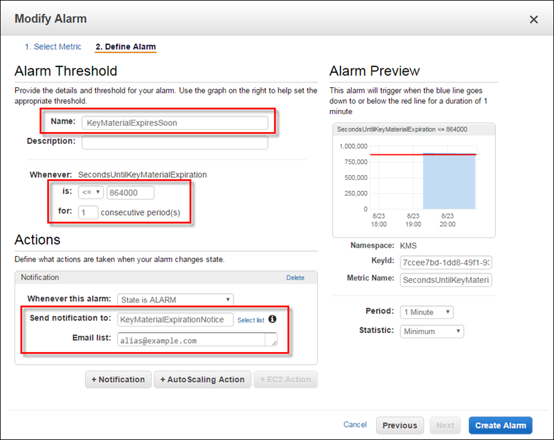 创建警报以监控已导入密钥材料的到期时间(Amazon Web Services Management Console)