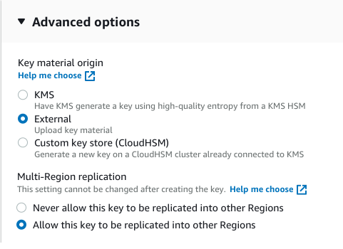 在 Amazon KMS 控制台中创建主密钥时,请使用 Advanced options(高级选项)部分中的设置。将密钥材料源设置为 External(外部)。将 Multi-Region replication(多区域复制)设置为 Allow this key to be replicated into other Regions(允许此密钥复制到其他区域中)。创建 KMS 密钥后,这些属性无法更改。