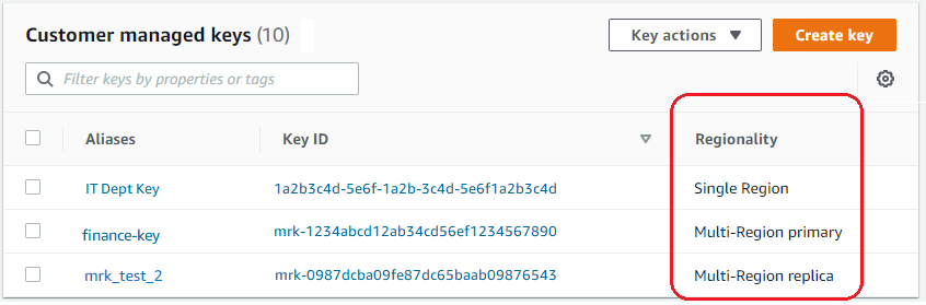 要在密钥表中仅显示单区域密钥或仅显示多区域密钥,请按每个密钥的 Regionality(区域性)属性筛选您的密钥。有关帮助信息,请参阅 对您的 KMS 密钥进行排序和筛选。