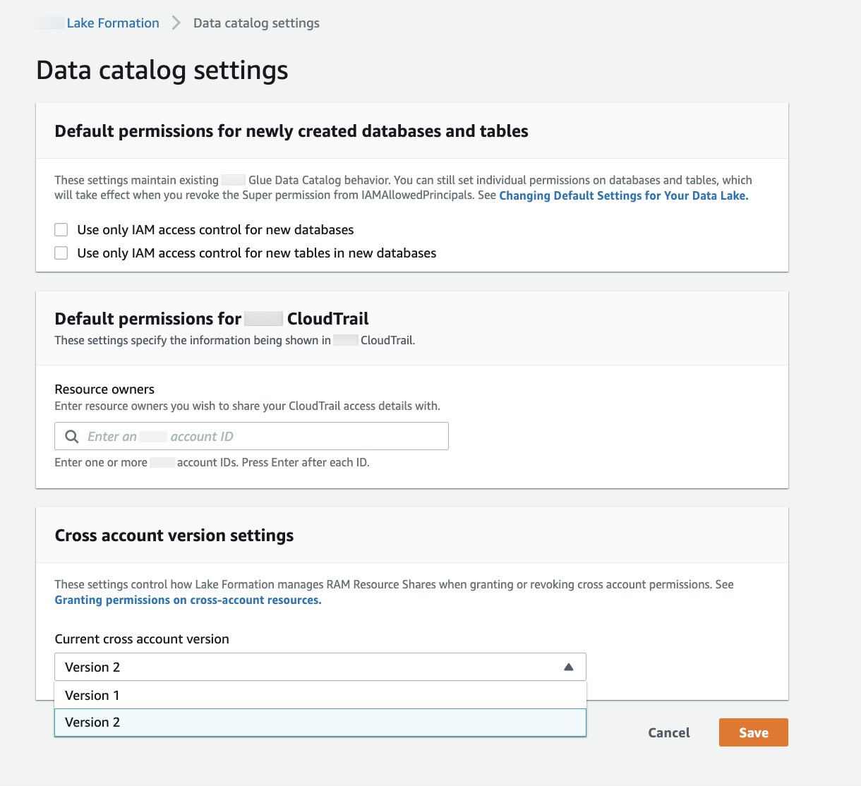 AWSLakeFormationCrossAccountManager托管 IAM 策略权限,则跨账户权限授予者角色或委托人不需要额外的权限设置。但是,如果跨账户授予者未使用托管策略,则授予者角色或委托人应具有以下 IAM 权限,新版本的跨账户授予才能成功。{ "Version": "2012-10-17", "Statement": [ { "Sid": "VisualEditor1", "Effect": "Allow", "Action": [ "ram:AssociateResourceShare", "ram:DisassociateResourceShare", "ram:GetResourceShares" ], "Resource": "*", "Condition": { "StringLike": { "ram:ResourceShareName": "LakeFormation*" } } } ] }选择版本 2下跨账户版本设置在数据目录设置页. 如果你选择版本 1,Lake Formation 将使用默认的资源共享模式。