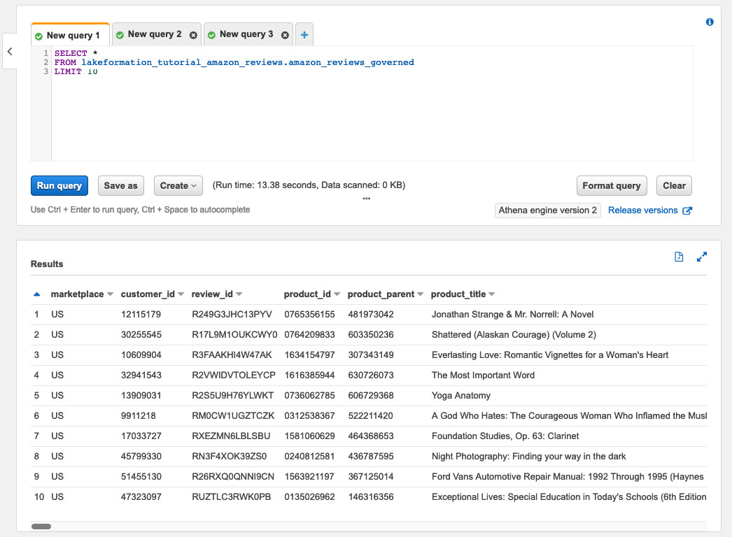 SELECT product_category, count(*) as TotalReviews, avg(star_rating) as AverageRating FROM lakeformation_tutorial_amazon_reviews.amazon_reviews_governed FOR SYSTEM_TIME AS OF TIMESTAMP '2021-05-26 08:15:00 UTC' GROUP BY product_category这些区域有:结果屏幕包含以下内容的记录