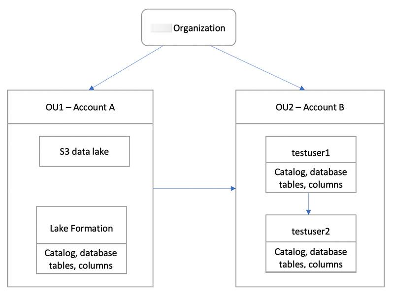 用例假设你正在使用Amazon Organizations来管理您的Amazon Web Services 账户. 一个组织单位 (OU1) 中账户 A 的用户向 OU2 中账户 B 的用户授予访问权限。在不使用 Organizations 时,例如只有几个账户时,您可以使用相同的方法。下图说明了数据湖中数据集的精细访问控制。账户 A 中的数据湖可用。账户 A 的数据湖管理员为账户 B 提供精细访问权限。该图还显示,账户 B 的用户向账户 B 中的其他用户提供账户 A 数据湖表的列级访问权限。