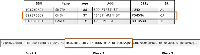 此第一个图示说明通常如何将数据库表中的记录(按行)存储到磁盘块中。