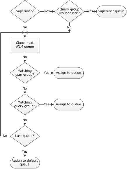 当用户运行查询时,WLM 基于 WLM 队列分配规则将查询分配给第一个匹配的队列。