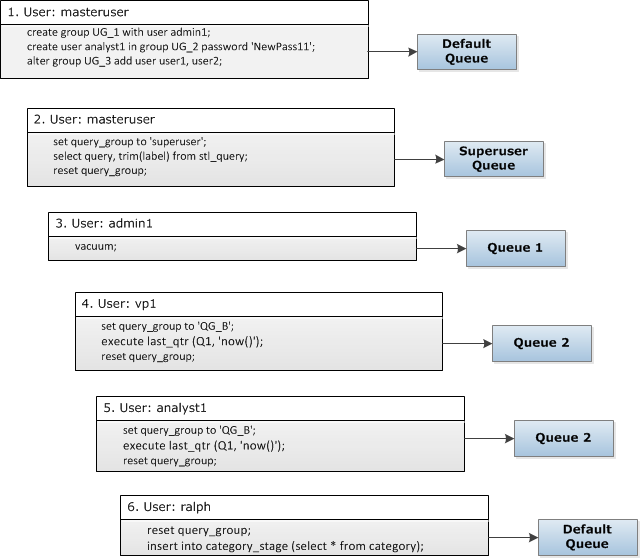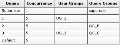 下面的插图介绍系统如何根据用户组和查询组将查询分配给前一个表中的队列。有关如何在运行时将查询分配给用户组和查询组的信息,请参阅本节后面的为队列分配查询。