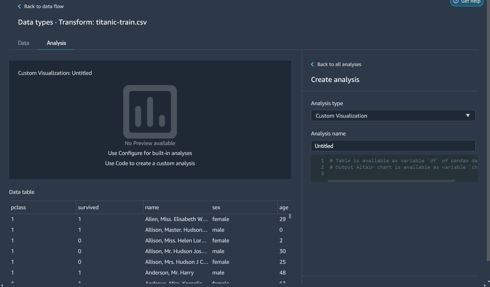 您可以将分析添加到 Data Wrangler 流程以创建自定义可视化。您的数据集以及已应用的所有转换,都可以作为熊猫 DataFramedf变量来存储数据框。您可以通过调用变量来访问数据框。