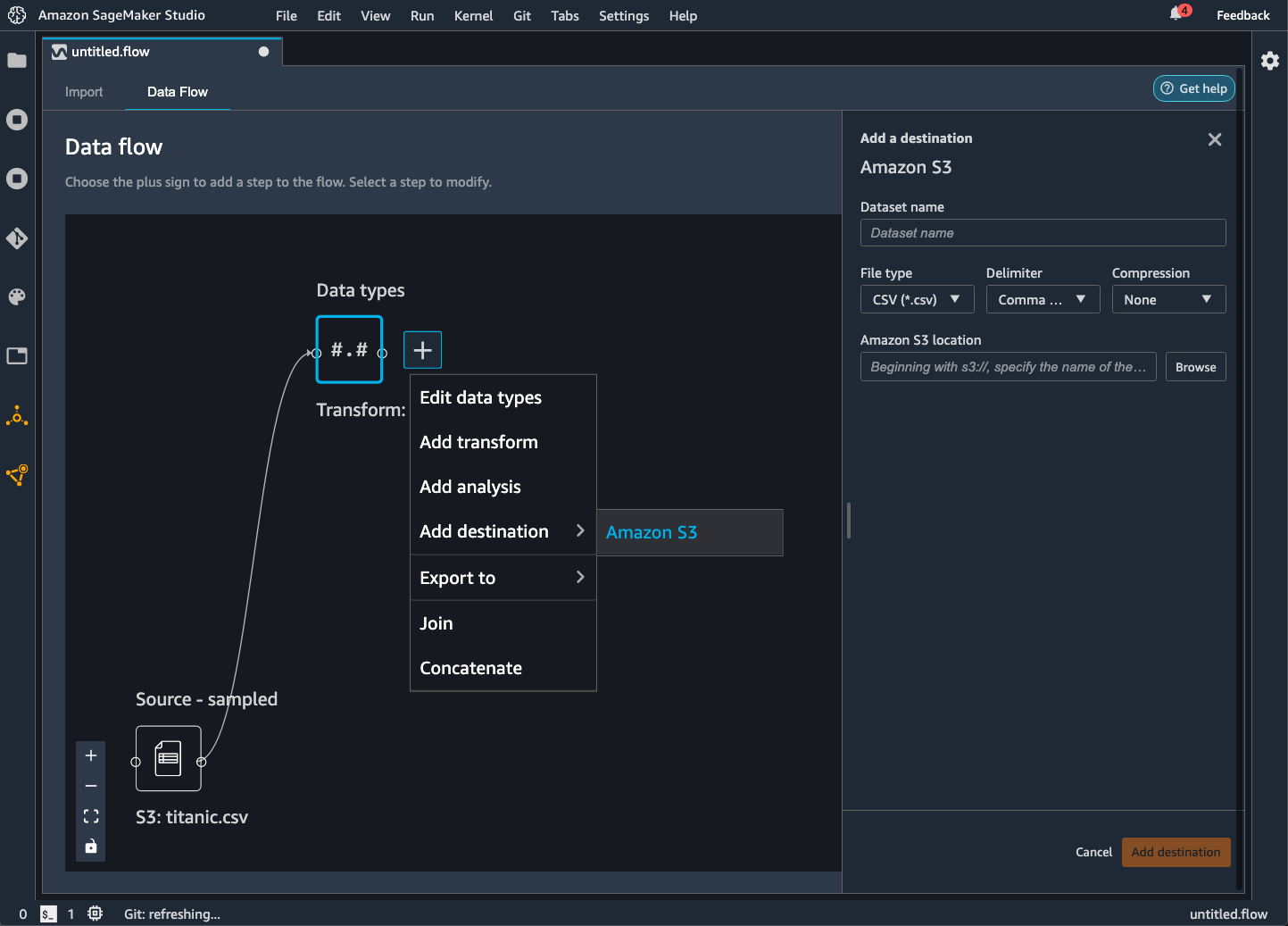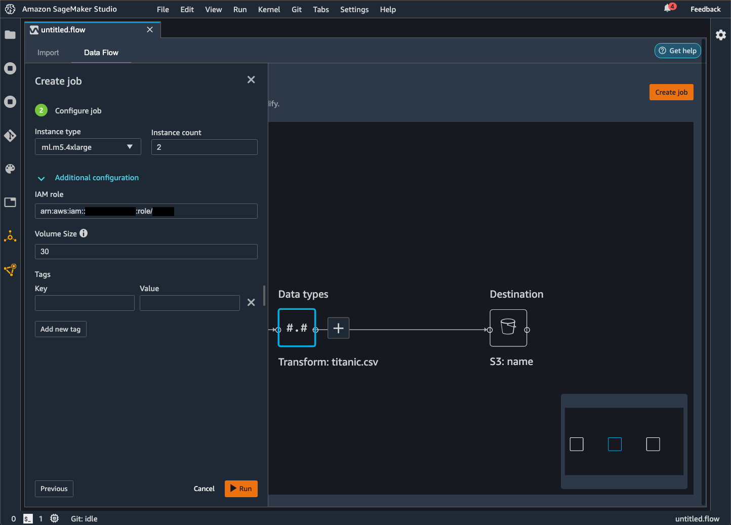 当你运行笔记本时,它会将数据流(.flow 文件)导出在同一个Amazon区域作为数据 Wrangler 流。