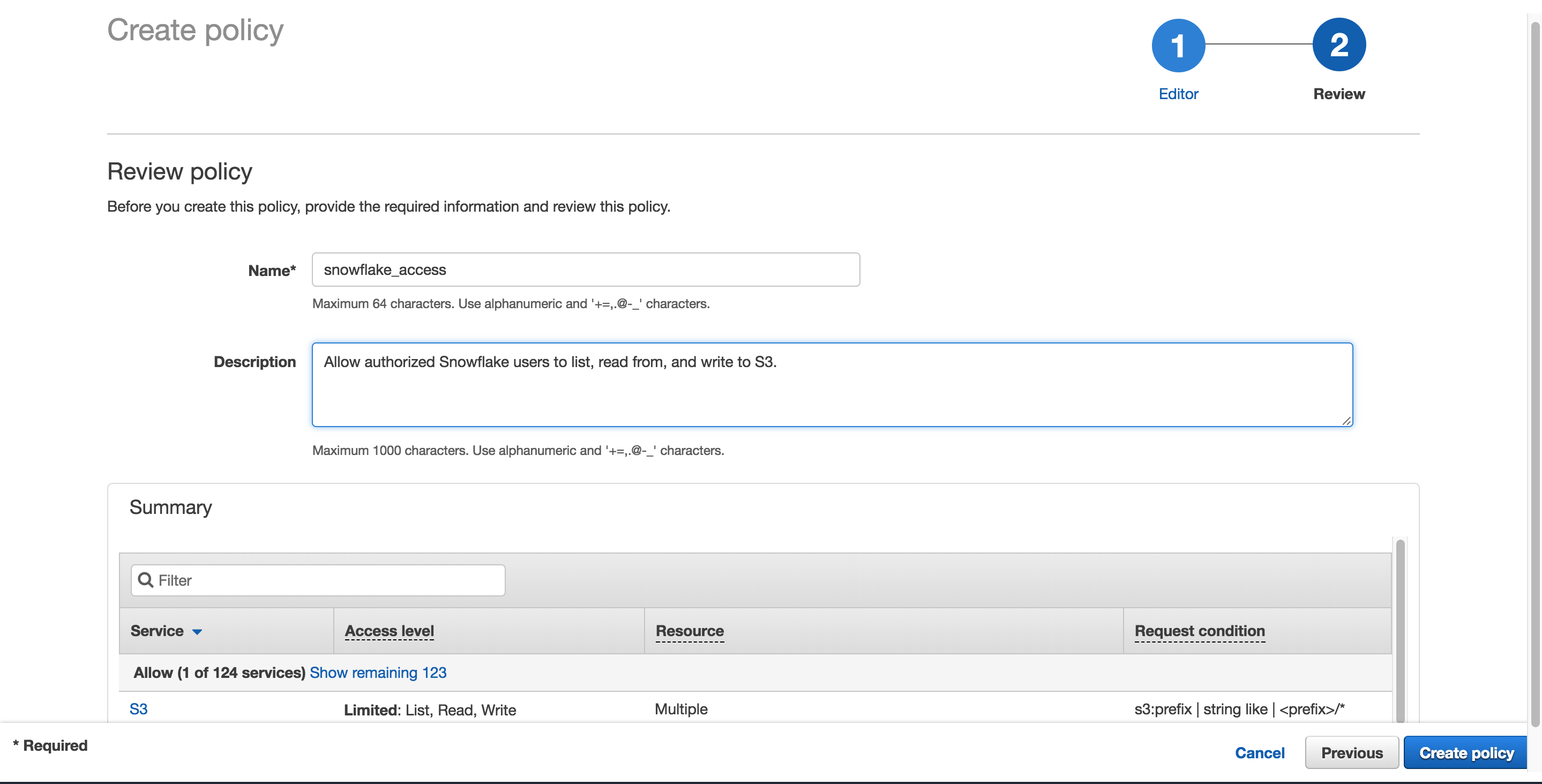 如果选择创建新角色,您将获得提供 S3 存储桶名称的选项,并为您生成策略。