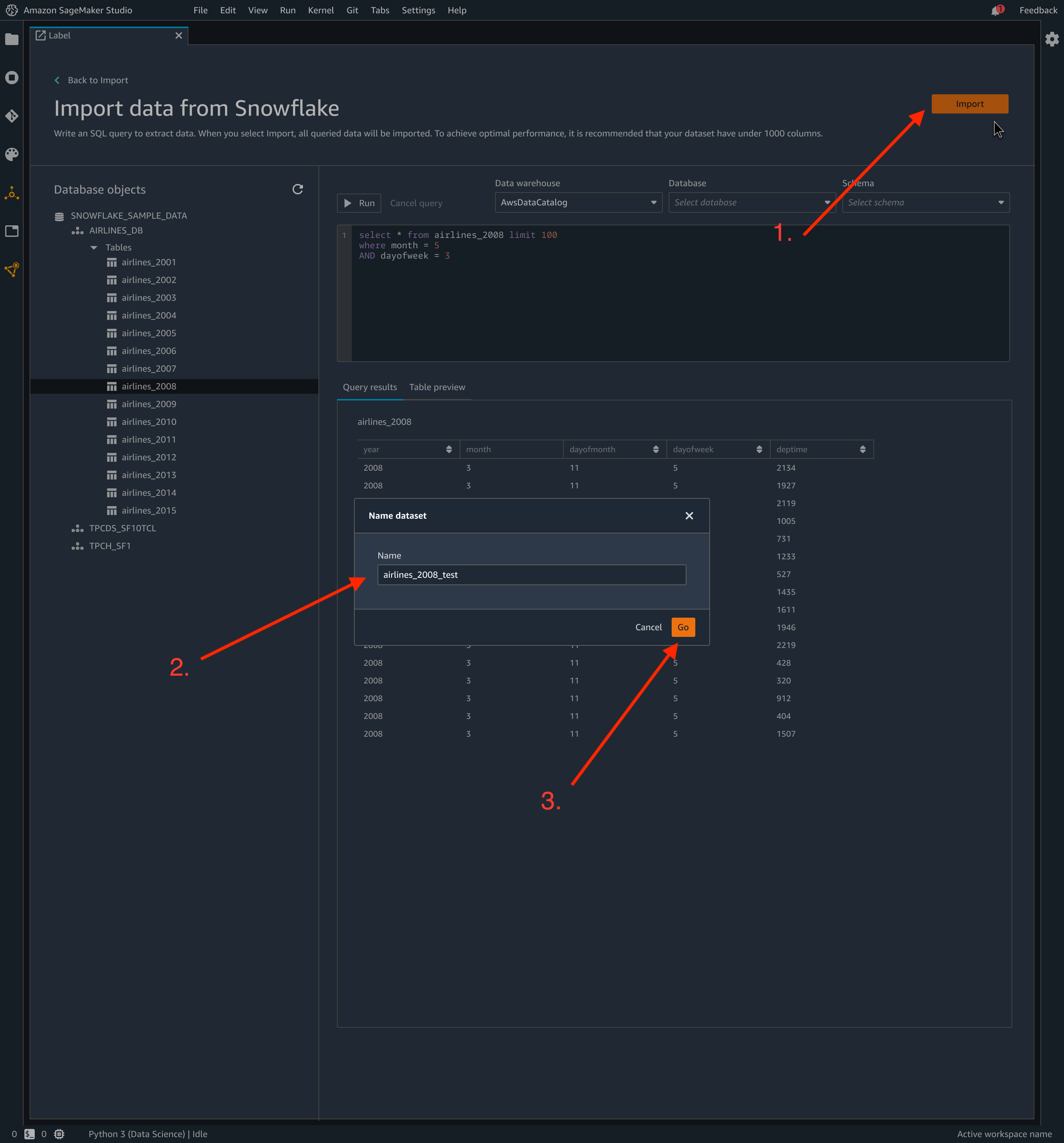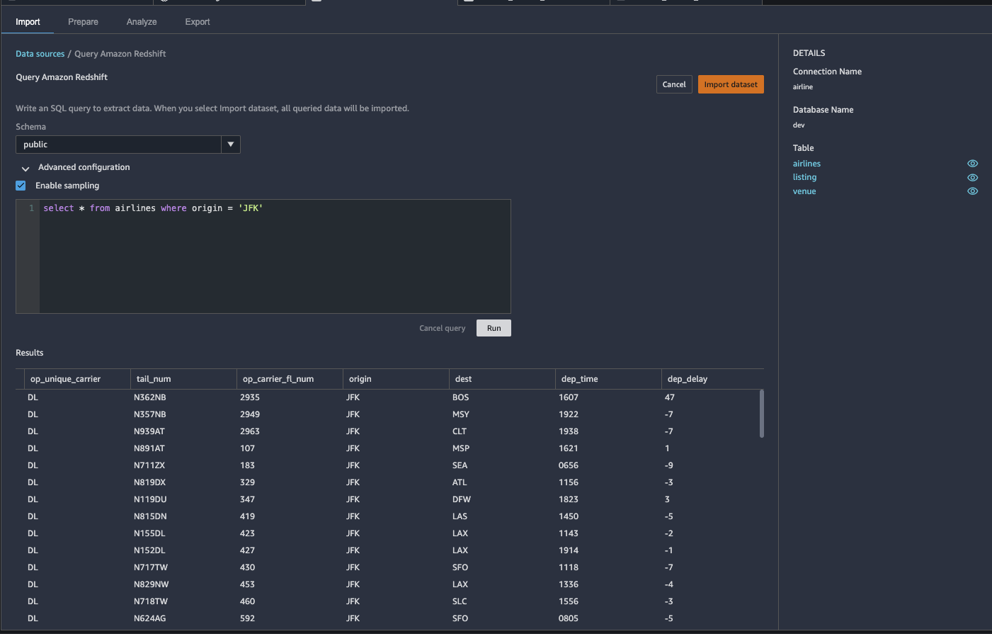 通过选择导入的数据集导入数据集在 Amazon S3 中以 Parquet 格式存储。