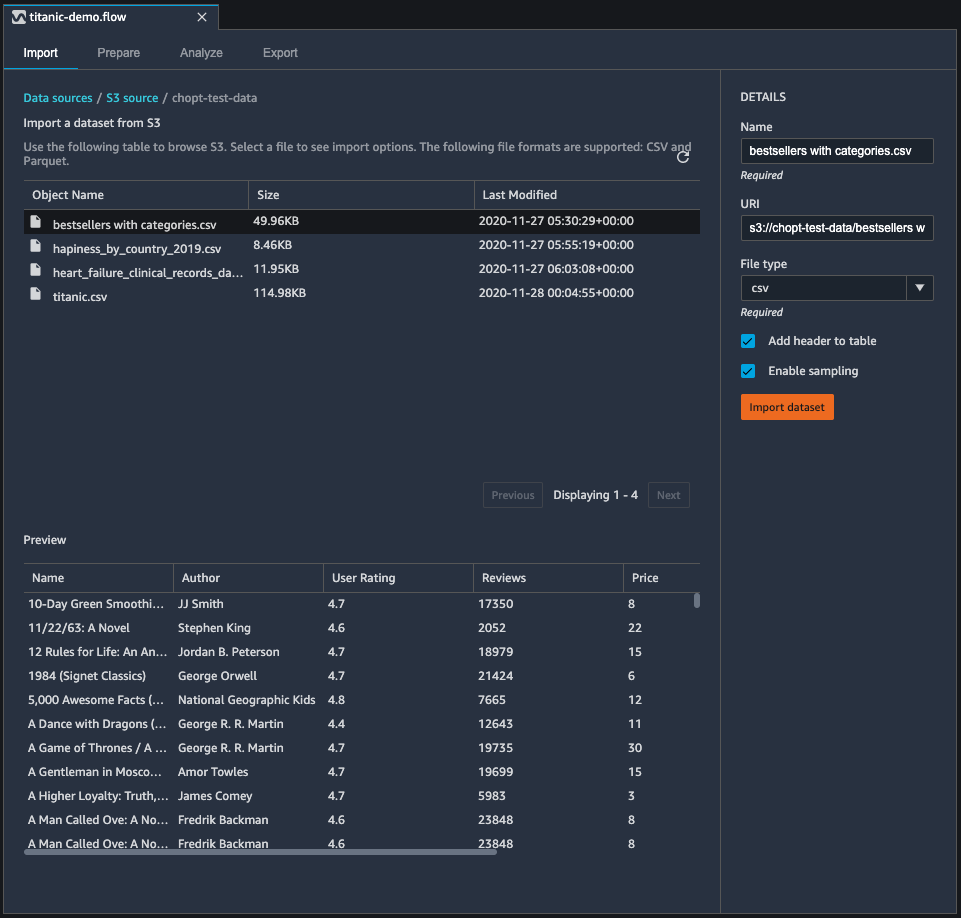 当您导出并使用数据流处理数据时,您导出的 .flow 文件会引用 Amazon S3 中的此数据集。请参阅以下部分了解更多信息。