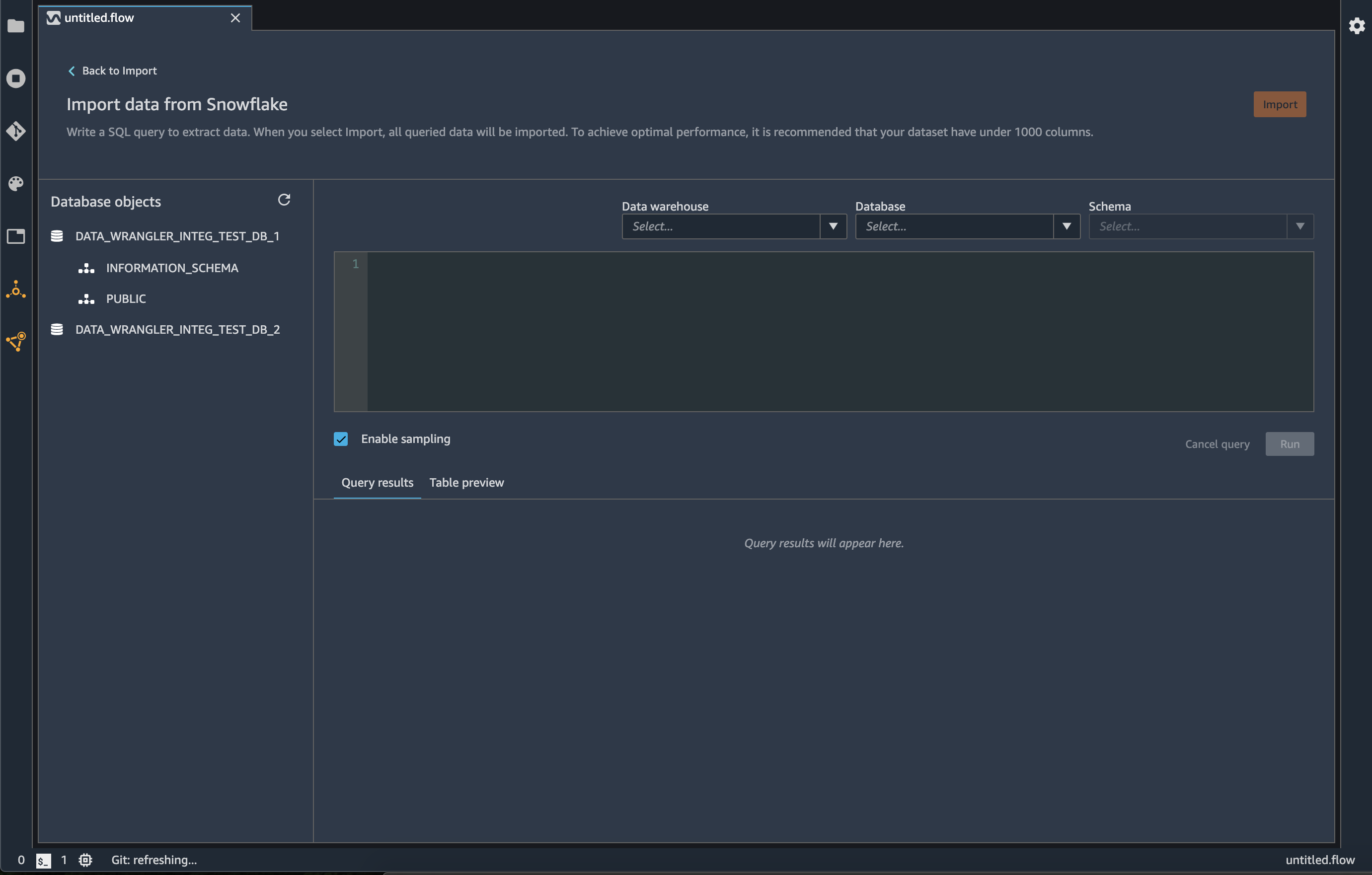 启用采样默认处于选中状态。激活采样后,Data Wrangler 会对查询的数据进行采样并导入大约 50%。取消选中此复选框可关闭采样。