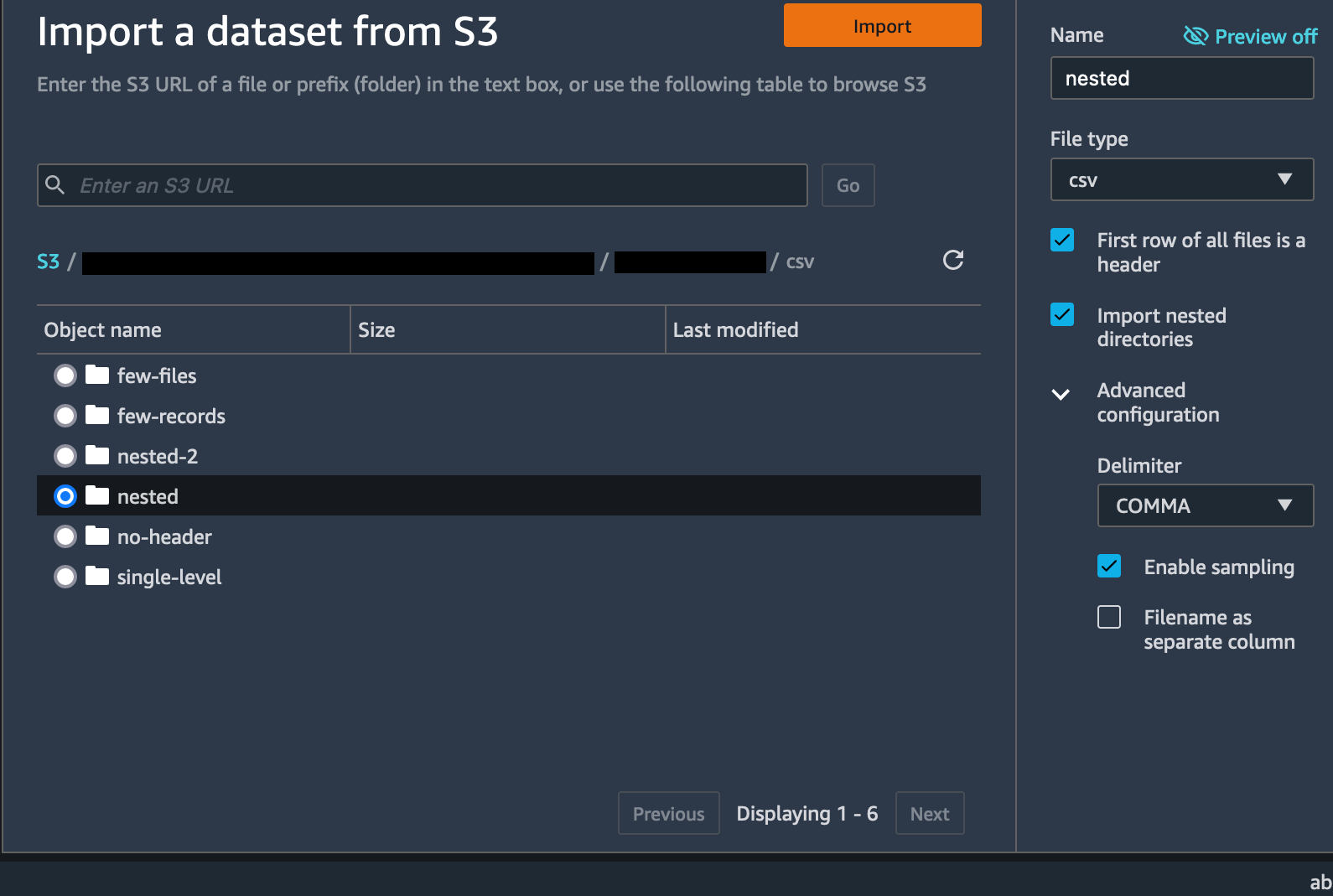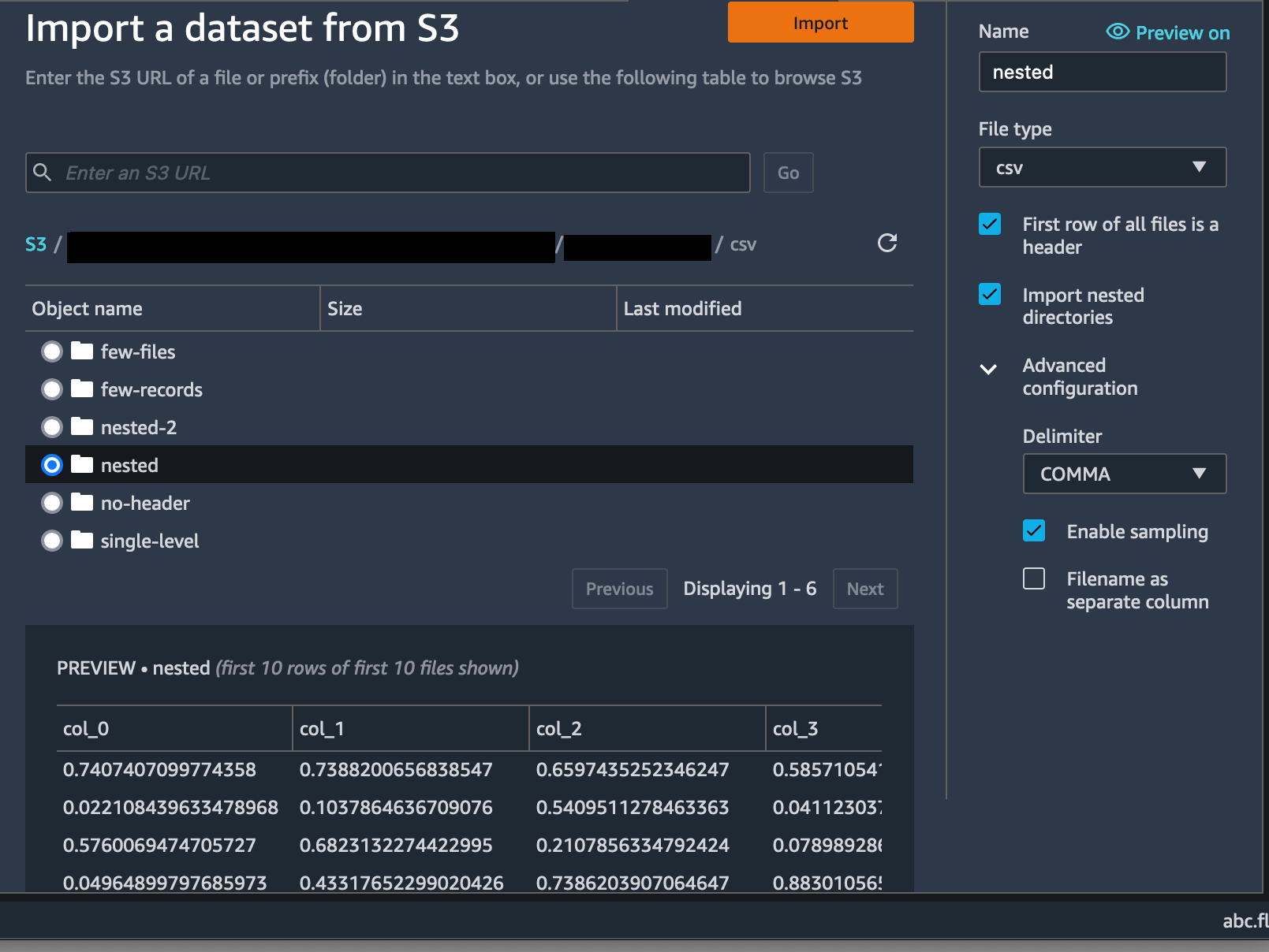您可以将单个文件或多个文件作为数据集导入。当数据集被分区为单独的文件时,可以使用多文件导入操作。它从 Amazon S3 目录中获取所有文件,并将其作为单个数据集导入。有关可导入的文件类型以及如何导入这些文件的信息,请参阅以下内容。