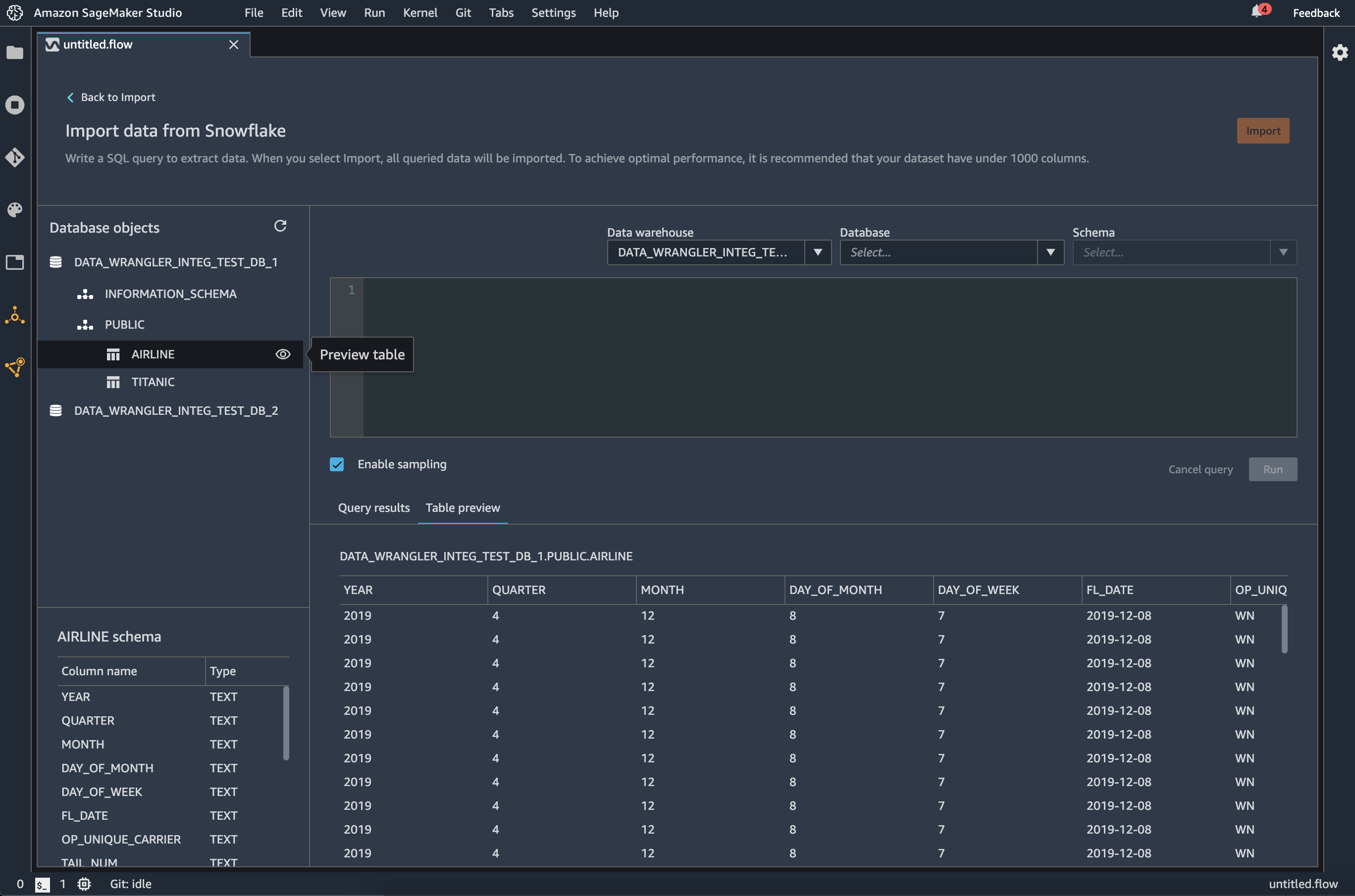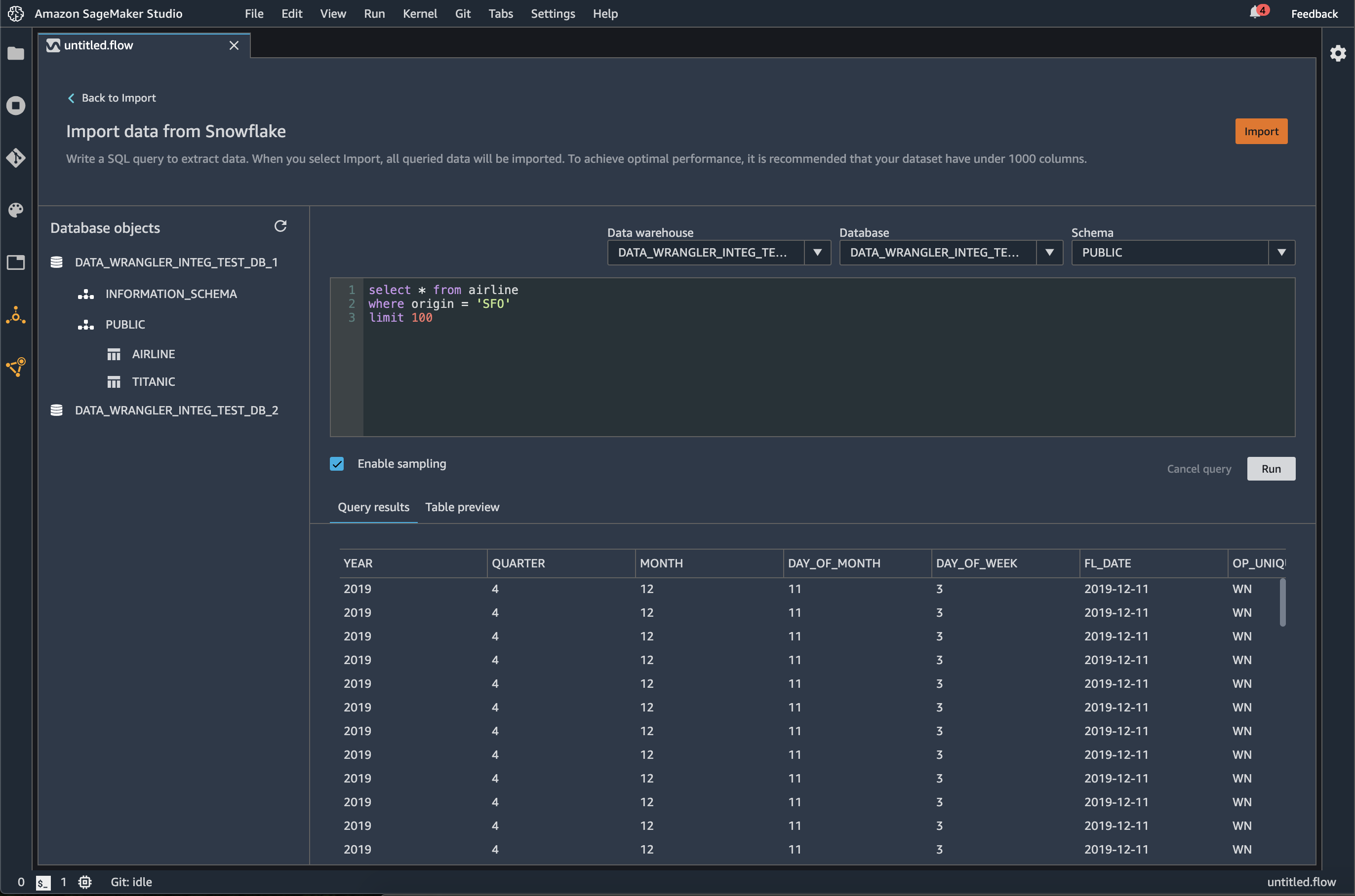 UNDER高级配置、启用采样默认处于选中状态。如果不取消选中此框,Data Wrangler 会对查询的数据进行抽样并导入大约 50% 的查询数据。取消选中此复选框可关闭采样。
