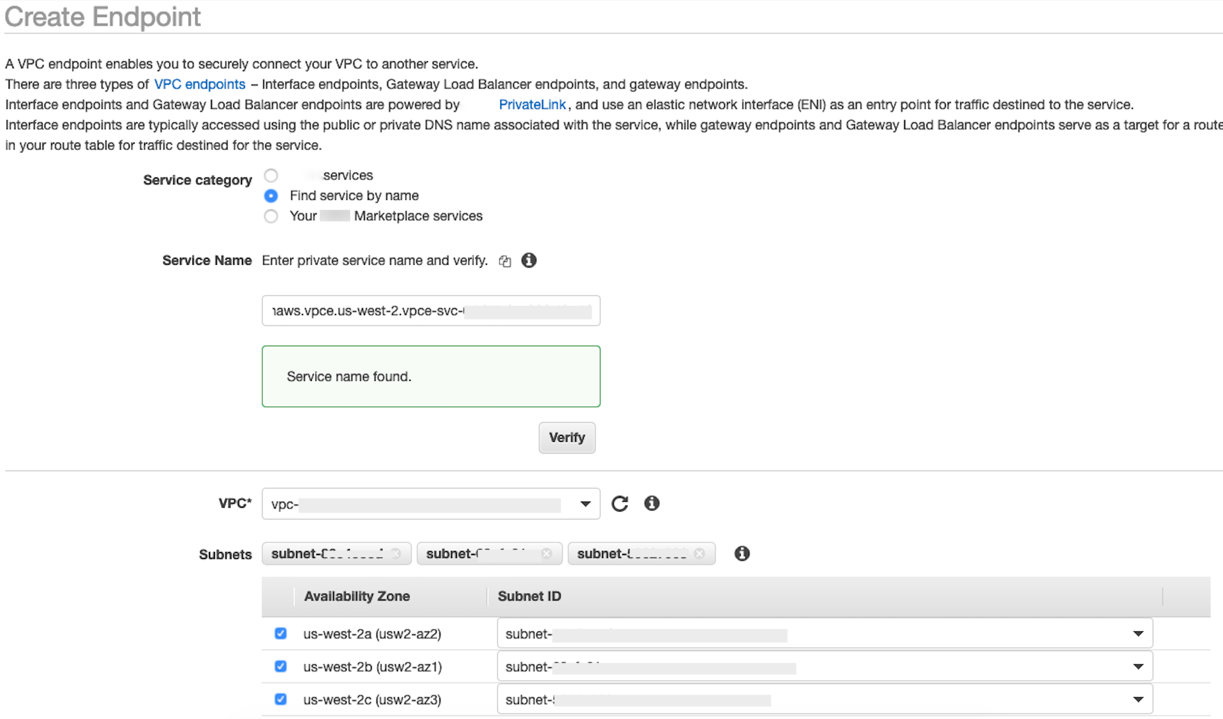 在Subnets部分中,选择有权访问 Snowflake 的子网 PrivateLink 连接。
