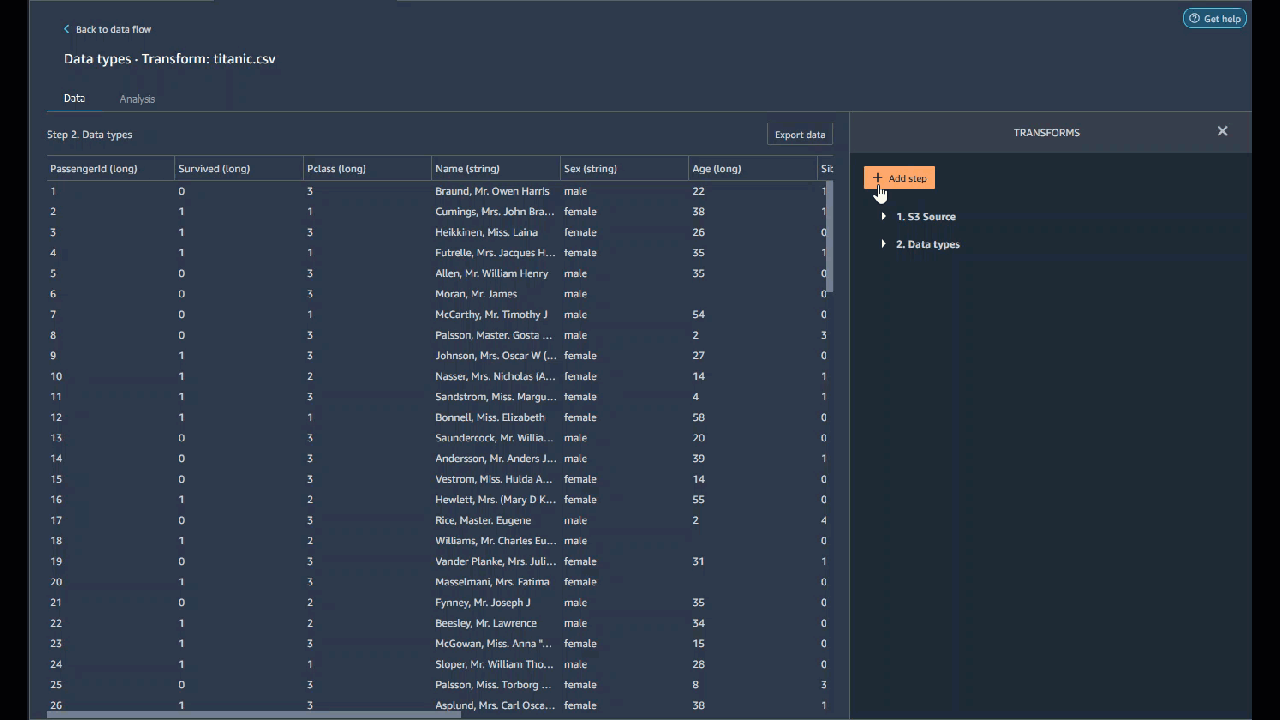 亚马逊 SageMaker Data Wrangler 提供了许多机器学习数据转换,以简化数据的清理、转换和特色化。添加转换时,它会为数据流添加一个步骤。您添加的每个变换都会修改数据集并生成新的数据框。所有后续变换都适用于生成的数据框。