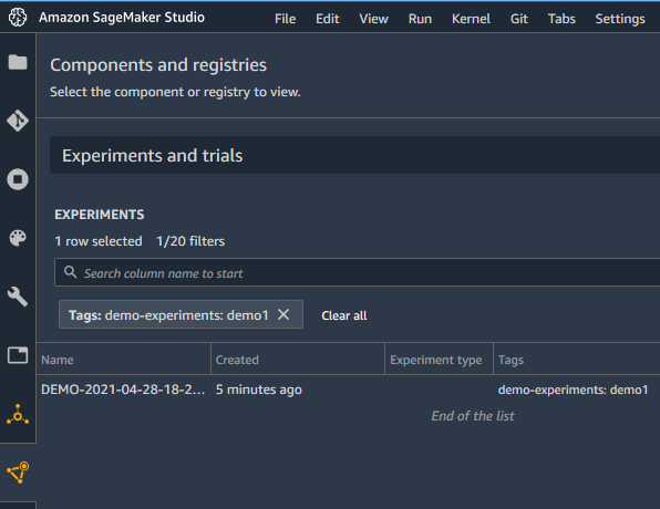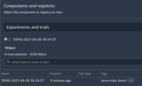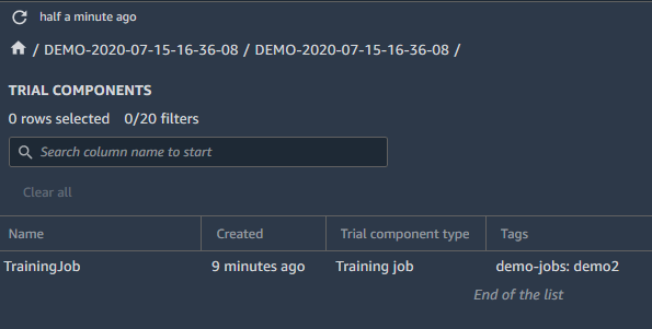 create_training_job( ..., "ExperimentConfig": { # "ExperimentName" "TrialName" : demo_trial.trial_name, "TrialComponentDisplayName" : "TrainingJob", }, "Tags": [{'Key': 'demo-jobs', 'Value': 'demo2'}]) -