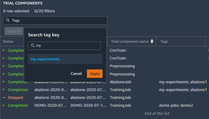 试验组件列表仅显示标签与您选择的键值对匹配的那些组件。