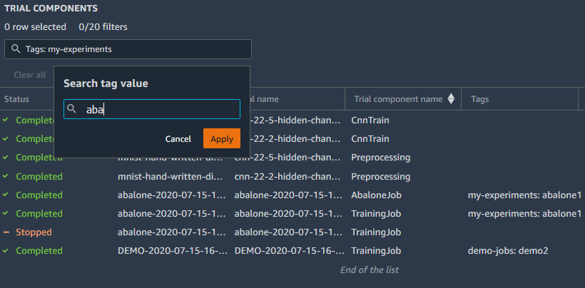 In搜索标签值,输入完整的标签值,然后选择Apply.