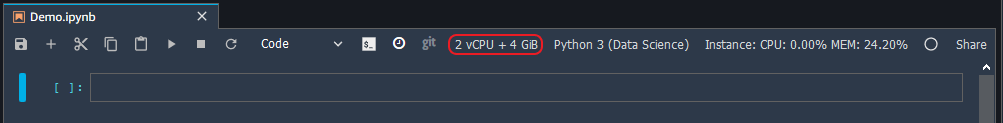 以下屏幕截图显示 Studio 笔记本中的菜单。支持笔记本的实例类型的处理器和内存显示为 2 vCPU + 4 GiB。