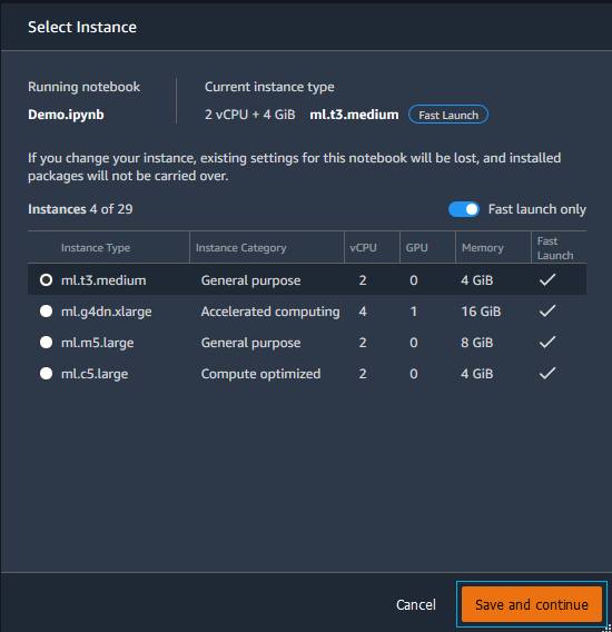 以下信息仅适用于 Studio 笔记本电脑。有关如何更改 Amazon 实例类型的信息 SageMaker 笔记本实例,请参阅更新笔记本实例.