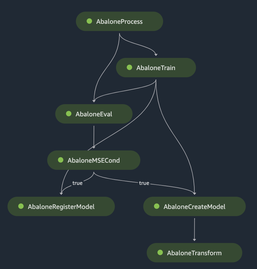 Amazon SageMaker 模型构建管道管道是由 JSON 管道定义定义的一系列相互关联的步骤。此管道定义使用有向无环图 (DAG) 对管道进行编码。此 DAG 提供了有关管道每个步骤的要求和关系的信息。管道的 DAG 结构取决于步骤之间的数据依赖关系。这些数据依赖关系是在步骤输出的属性作为输入传递给另一个步骤时创建的。下图是管道 DAG 的示例: