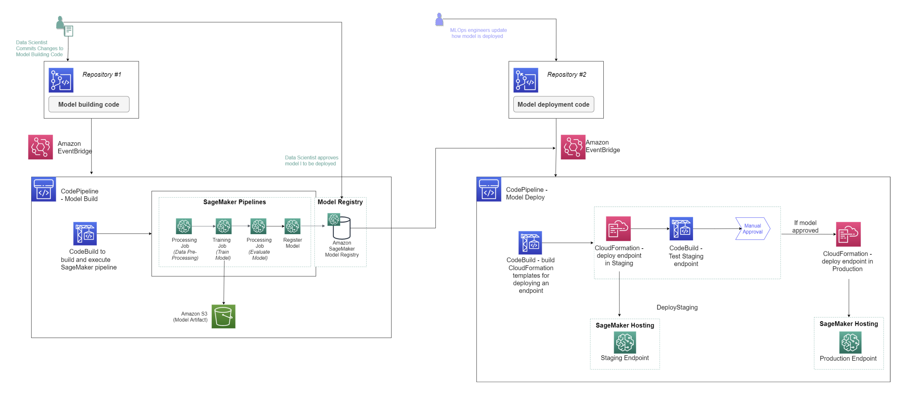 您可以预置 SageMaker 来自Amazon使用自定义模板或 SageMaker 提供的模板的 Service Catalog。有关的信息Amazon请参阅 Service Catalog什么是AmazonService Catalog. 与 SageMaker 项目、mLOP 工程师和组织管理员可以定义自己的模板或使用 SageMaker 提供的模板。SageMaker 提供的模板通过源代码版本控制、自动机器学习管道和一组代码来引导机器学习工作流程,以便快速开始迭代 ML 用例。